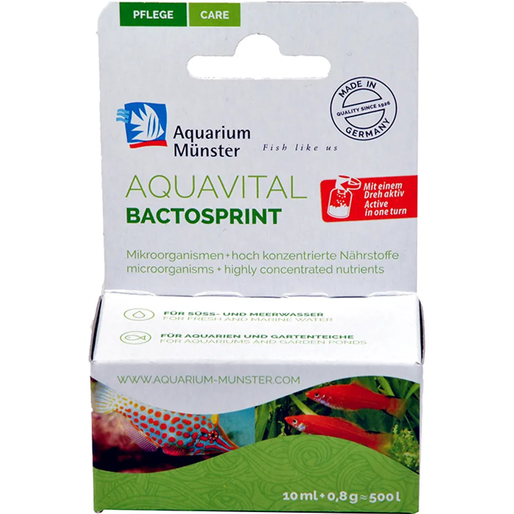 Münster Bactosprint är en kraftfull bakteriekultur som förkortar uppstartsfasen i akvariet och stabiliserar ekosystemet. Perfekt vid uppstart av nya akvarier, efter filterrengöring eller vattenbyte.